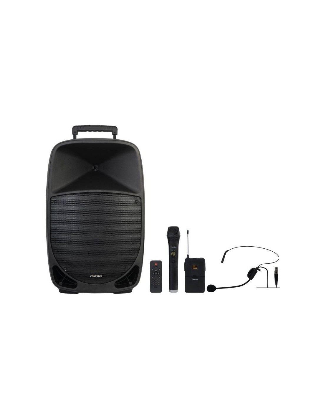 Altavoz portátil con reproductor Bluetooth/USB/microSD/FM/LINE y 2 micrófonos inalámbricos UHF (1 de mano y 1 de cabeza).