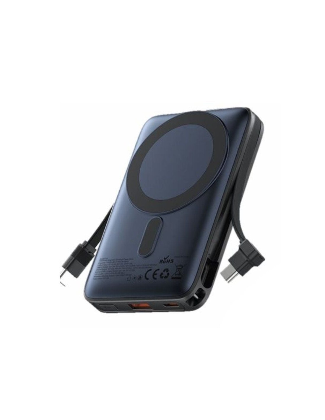 Batería externa magnética de 10,000 mAh (USB-C + USB-C/USB-A/Inalámbrico) con cable incorporado y soporte. Potencia de salida: 22.5 W Pantalla LED blanca Material: ABS con recubrimiento UV Soporte de aleación de aluminio